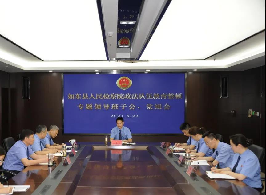 根据政法队伍教育整顿统一部署,6月23日上午,如东县人民检察院召开队伍教育整顿专题党组会,通报队伍教育整顿情况,并就整治效果作出承诺。县检察院党组书记方海军主持会议,全体班子成员参会。