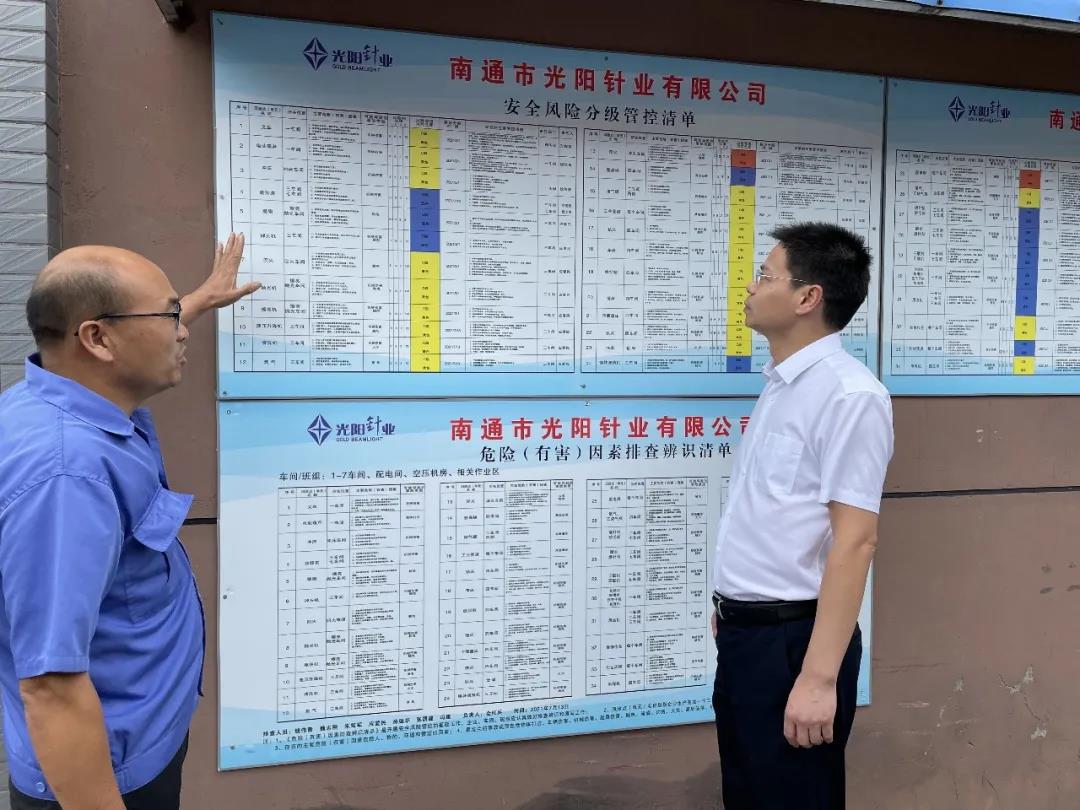 方海军先后来到南通世纪天虹有限公司和南通市光阳针业有限公司,深入厂区,实地查看厂区安全运行状况和安全生产消防设施,认真了解企业落实安全生产主体责任、重要设施维护、日常隐患排查治理、应急救援演练、作业环境健康防护等情况,并叮嘱企业负责人,坚持安全至上、生命至上,从严从细落实责任措施,全面排查整治风险隐患,督促员工严格按照操作流程作业,确保企业安全稳定生产。