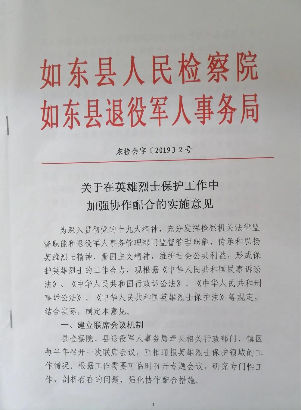 2019年如东县人民检察院即与该县退役军人事务局会签了《关于在英雄烈士保护工作中加强协作配合的实施意见》,建立了联席会议、信息共享与反馈、联合检查、线索移送、检察监督、联合宣传等相关工作机制,形成了保护英雄烈士的工作合力。