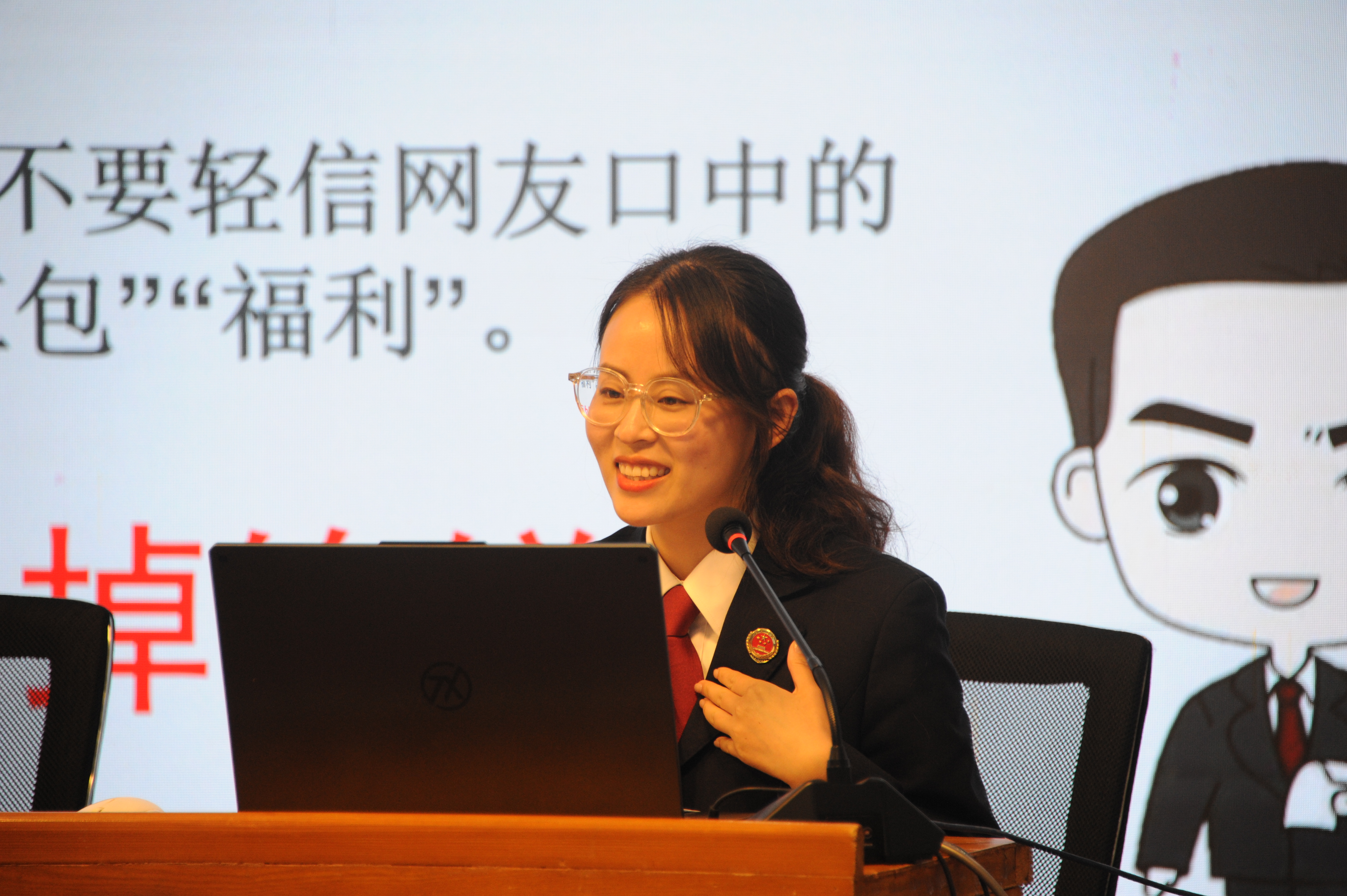 课上,袁张慧围绕“防范网络诈骗 练就‘火眼金睛’”主题,结合具体案例,从网络诈骗的特点趋势、常见手段、预防对策等三个方面对目前反诈形势进行了讲解。
