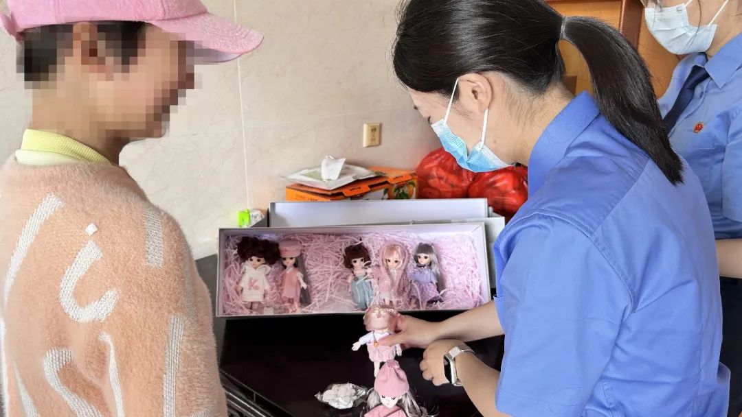 “阿姨,这个娃娃可以变装吗?”琳琳很喜欢干警带来的儿童节礼物,“我可以给她们做小衣服,这样就不会无聊了,我在外面不能待太久,但是可以和娃娃一起玩。”琳琳和干警阿姨们聊起了自己爱玩的游戏,当她听到干警阿姨小时候和洋娃娃“过家家”的故事时,脸上绽开了明媚的笑容,一双水灵灵的眼睛专注地看着检察官阿姨。